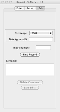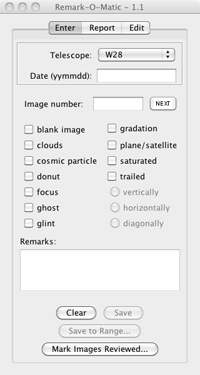 Remark-O-Matic is a Java application which is used to record comments on AAVSOnet images. It is designed to be used only by authorized individuals known as "Telescope Advocates".