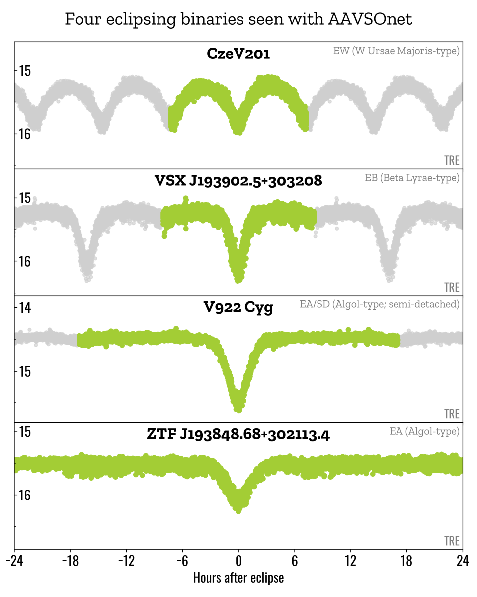 Using AAVSOnet, you can record data of high enough precision to study all sorts of interesting stars. Here are a few examples drawn from the hundreds of light curves produced by observers using AAVSOnet so far: