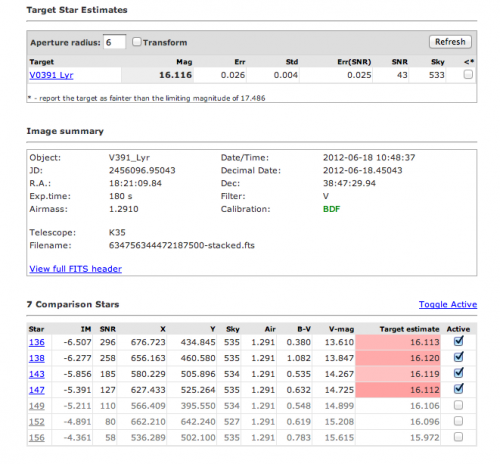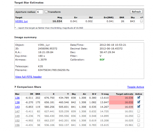 Now if I stack 4- 180 second images my SNR goes up to 43 and the error computed from SNR is down to 0.026, much more like what I prefer to see. I also have 5 comp stars with SNR>100 to use if I choose to do so.