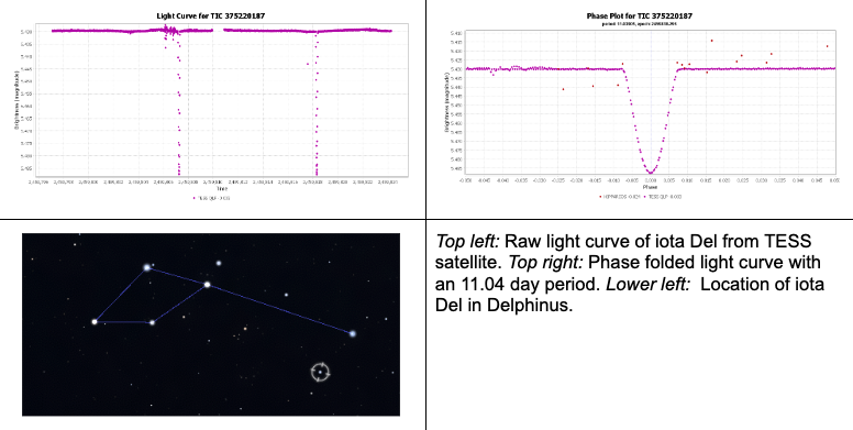 Using archival data from the TESS satellite, Maksym Pyatnytskyy (PMAK) discovered that iota Del (V~5.43) is actually an eclipsing binary with an 11.04 day period. Although the system was known to be a spectroscopic binary since 1919, nobody had detected the 55 milli-magnitude primary eclipse until now.
