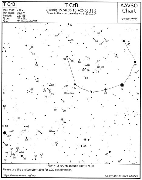 Please be aware that Alf CrB (star 22) is an eclipsing binary with a 17-day period and 13-hour eclipse of depth 0.1 mag. Observers should make independent estimates of T CrB using both the 22 and 28 stars when T CrB is at its maximum brightness.