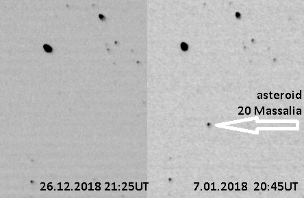 I've also found asteroid 20 Massalia near the edge of photos taken on 7th of January 2018 with brightness ~8,9V (north is on the left and west - up).