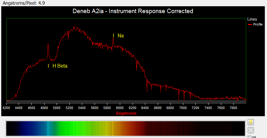 I captured a spectrum of Deneb on 10-1-14 and it shows some nice Hydrogen-beta and Sodium emission lines. Other spectra the same night show these lines as absorption lines. Anyone want to try and expain the source of the transient emission lines?