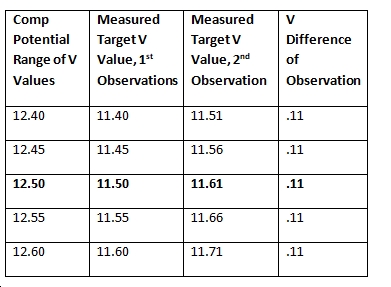 Obviously, this shows that no matter at what point along the range of uncertainty the “actual” comp value might be (and potentially used for computing the Target V value) the measured difference, between the two observations, is always going to be the same! Keep in perspective that the comp value uncertainty, for the original measurement, is not varying and that all observers who measure the target are going to measure the same .11 difference, everything else being equal (same time, for example), except for their own uncertainty value which is very important to the difference measurement.