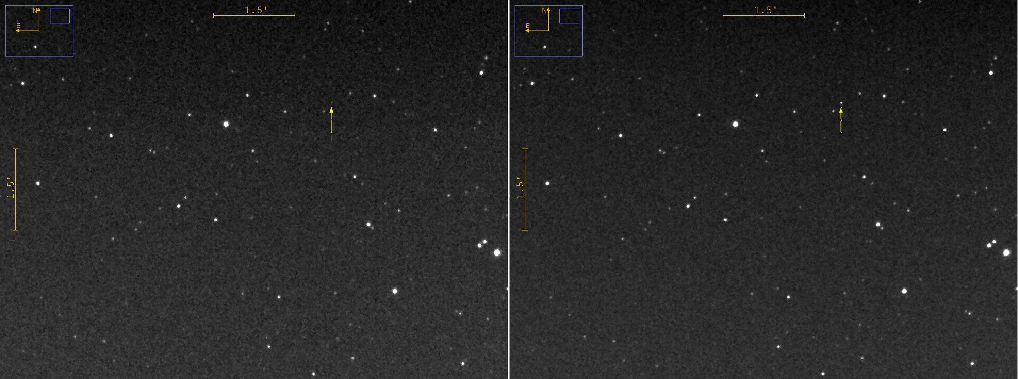 A series of 20 images were made that night and the flare appears only in frame 3. The faint (> mag 16) star is visible in all of the images.