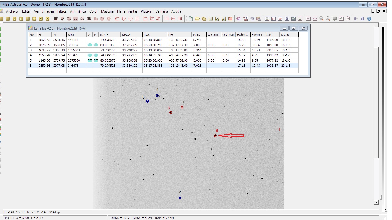 estoy haciendo fotometría sobre el sistema binario AR AUR y comprobando las estrellas dentro del campo... me encuentro a TYC 2394-90-2 la cual veo que la magnitud obtenida dista mucho de la que media en SIMBAD, concretamente yo obtengo 7.02 (TG) y la indicada en el canal verde del catalogo SIMBAD es de 7.83 V, dada la dispersión que obtengo en mi fotometría (0.02) considero que la diferencia es mucha. La fotometría que realizo es de conjunto 3 stars de comparación.