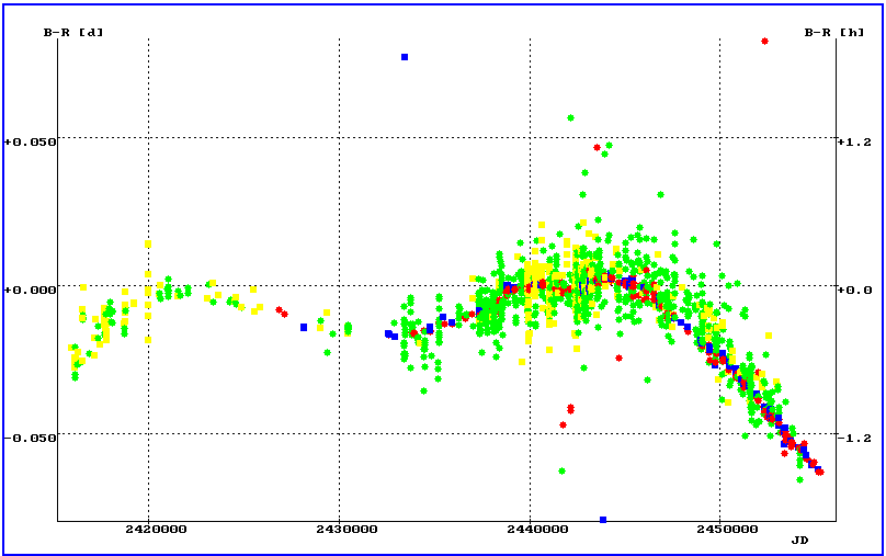 Scanning the databases of times of minima, e.g. at Cracow, and the LkDB, and the frequent publications of newly recorded times of minima such as those in JAAVSO, VSOLJ, and OEJV, the overwhelming majority of the reported observations are now being made with CCD cameras, with a demonstrated accuracy approaching 0.0001 days, and generally better than 0.001 days. In this flood of high accuracy data, lower accuracy observations will likely be ignored by researchers. There have been some recent papers that dismissed all ToMs derived from visual observations, even from dates before any photoelectric data was available. This unfortunately means that new eclipse times deduced from visual observations are of much less interest to researchers than they used to be. They are still useful when monitoring a star of unknown period or phase, i.e. when 'scanning' to find an eclipse whose time can then be used to schedule higher accuracy observations. This O-C diagram for W UMa (which was screen captured from the BAV's LkDB site) tells the story. Visual ToMs (green and yellow) show far more scatter than CCD observations (red and blue), although the latter include some clearly erroneous observations.