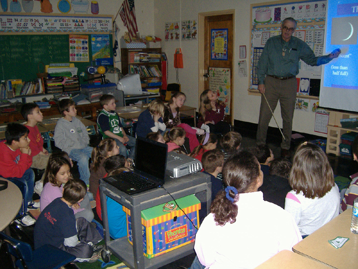 Since my retirement from daily music teaching in the Dartmouth Public Schools I have developed a program of astronomy instruction for elementary schools called "Have Scope — Will Travel." PowerPoint slide shows on solar, lunar, planetary and stellar astronomy are geared for the classroom and precede observing parties for students and their parents. I also take my 5-inch refractor to where the public are in the good tradition of sidewalk astronomy.
