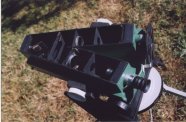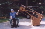 My 17.5" Dobsonian was built as one solid unit. This works well in a permanent observatory. In 1995 I built a second tube assembly for the same optics, this time with "some assembly required." The rocker box is collapsible, the octagonal head piece fits into the tail piece, and struts remain as four triangular units for quick assembly. Assembly takes about twenty minutes and collimation another ten. Smudge's assistance makes the work more enjoyable, but not significantly shorter in duration.