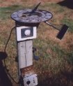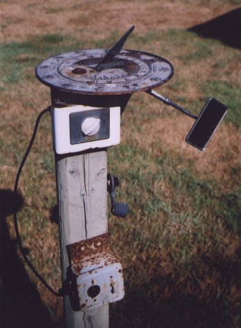 Rounding out my astronomical equipment is a partially viable sun dial. The gnomon and dial face work as they should; the remaining features are for the benefit of my fun-loving or gullible friends. Below the face is the wake alarm. Below that, the crank for winding it on cloudy days. Furthest down is the energy saver switch which I turn off during vacations. The rear-view mirror is for night use only. |