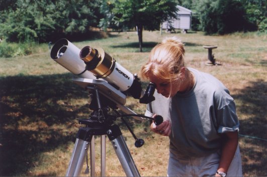 I used a variety of solar scopes before deciding upon the very practical and portable set-up of side-by-side 80mm refractors on an altaz mount. A spring serves as a counter-balance. With these twin scopes I make regular sunspot counts for the AAVSO and share the solar wonders with my students, friends and family. Pictured above is my daughter Laura.