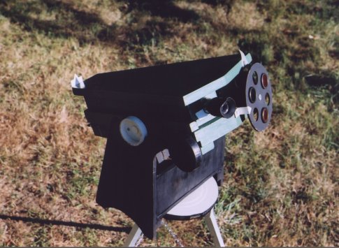 Another home-made instrument is my solar spectroscope. It was shown at the 1999 fall meeting of the AAVSO in Hyannis. It is made with two razor blades for a slit, a pair of surplus binocular objectives, a $6 grating, an elastic band for a tuner, and one commercial eyepiece. A filter wheel in front of the slit allows for greater definition in various portions of the spectrum. This simple instrument shows several hundred absorption lines and has been a very useful teaching tool. It won a special exhibit award at Stellafane in 1982.