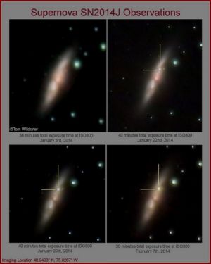 In only three weeks since its discovery on January 21, 2014, much has been learned about the new supernova SN 2014J in Messier 82, the “Cigar” galaxy. In addition to early confirmation based on its spectrum that it is indeed a type Ia supernova, it is now understood to be the nearest type Ia explosion to our Milky Way galaxy since 1986.