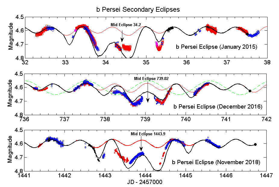 Figure 1. The three previously-observed secondary eclipses of b Persei. The solid black curves are a simple model fit to the observations. The different colors and symbols in the observations represent the individual observations contributed by the various observers. The dashed sinusoidal curve in the middle panel represents the graphical radial velocity of the component star A based on data from A. Miroshnichenko. The red solid sinusoidal curves in each panel represent the fit to ellipsoidal data. The heavy black curves are a simple model fit to the observations.