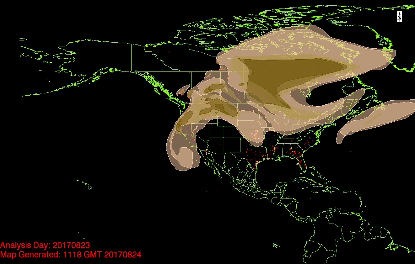 The attached image shows the NOAA-HMS smoke analysis chart for August 23 and the wildfire smoke seems to be very noticeable across northern states and much of Canada.