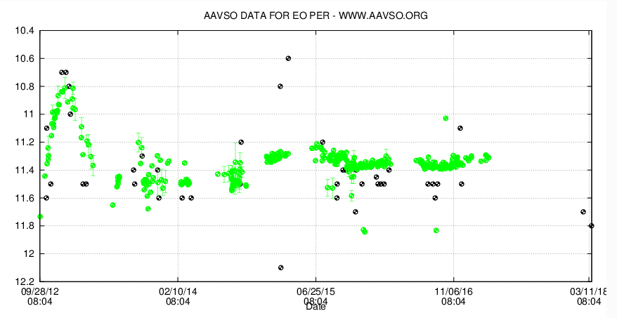 EO Per seemed to be quite faint yesterday. Can somebody have a look? (It could be me, I was near observing limit). EO Per has a nice and interesting light curve. It seems a bit forgotten, but it's certainly worth a visit.!