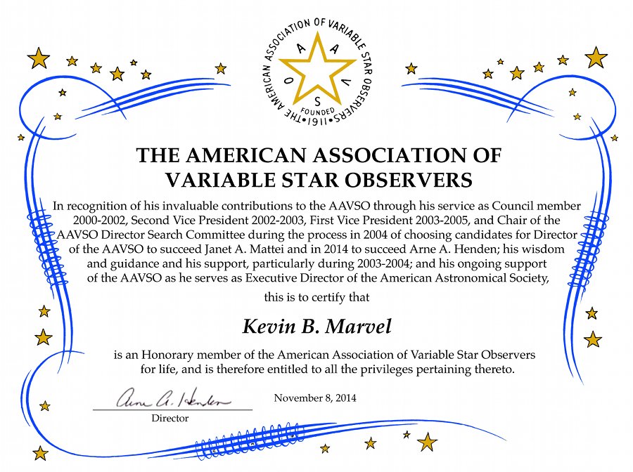 Marvel, Kevin B. (AAVSO; vice-president, American Astronomical Society; 2014) [Full text of citation] [image of certificate]