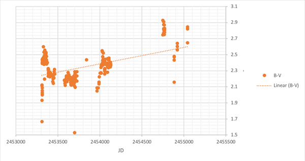 I loaded in Excel all of the Johnson V observations which had a corresponding Johnson B observation in order to track B-V over time. A vast majority of the B and V data came from Dale Mais (MVD) who regularly observed the star from JD 2453309 to 2454127. The most recent B-V data (from 2454759 on) came from Ray Tomlin (TRE). The correlation isn’t very strong, but the star does appear to become redder (B-V is increasing) over time. More data will be needed to verify this trend.