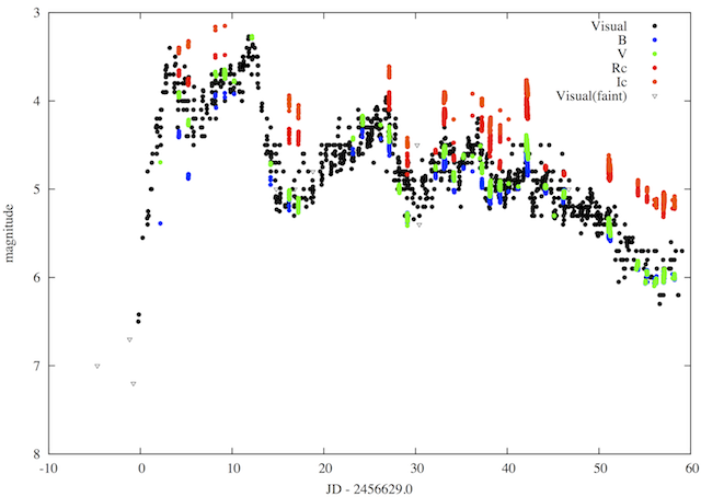The fact that the gamma-ray production correlates with the optical light curve in Nova Cen again makes it clear how important your contributions are. Both visual and instrumental observations are needed, and if you are making instrumental observations, filtered and transformed calibrated data will be especially valuable. Note that Nova Cen is an especially good target for DSLR observers; it's very bright, and many DSLRs will have a wide enough field to include good comparison stars. Please see our overview of Nova Delphini 2013 for more information on how best to observe bright novae instrumentally.