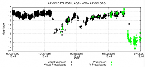 Throughout the 1980's and 90's the star went through a very protracted bright phase. This was followed by the onset of a new period of great activity culminating in the "great deep minimum" it is experiencing currently. I must say that this is one occasion when I'm truly grateful to see the work of our CCD observers, as U Aqr is far beyond the range of any of our visual people these days.