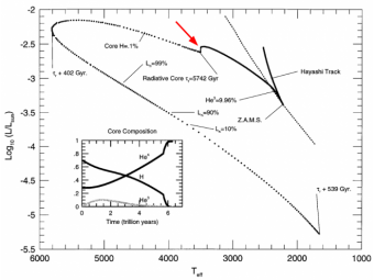 But why do we want to study the evolution of low mass stars, and their less than imminent demise? There are various good reasons. First, galaxies are composed of stars —and other things, but here we focus on the stars. Second, low-mass stars are by far the most numerous stars in the galaxy, about 70% of stars in the Milky Way are less than 0.3 solar masses (also denoted as 0.3M☉). Third, low-mass stars provide useful insights into stellar evolution: if you want to understand why heavier mass stars evolve in a certain way —e.g. develop into red giants— it is helpful to take a careful look at why the lowest mass stars do not.