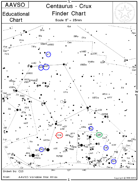 Eight program stars are located in Centaurus. R CEN and T CEN are by far the most observed. RV CEN is a distant third in terms of total number of visual observations.