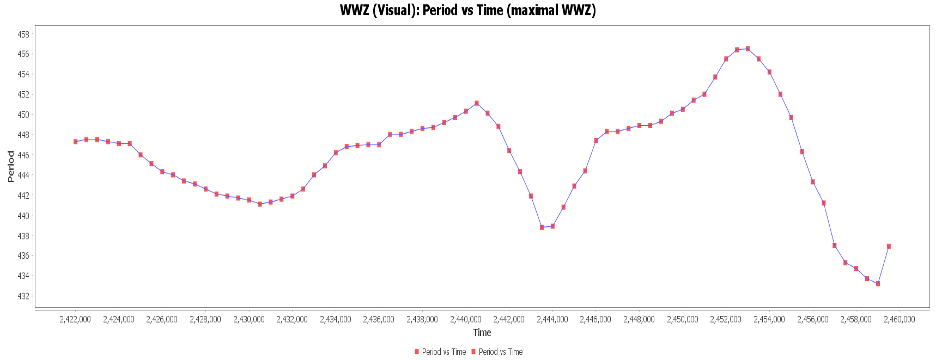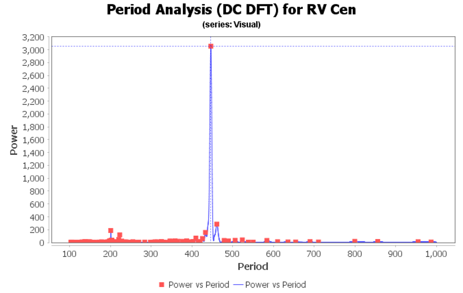RV CEN is clearly monoperiodic. Utilizing the entirety of visual data in the AID, the star’s period has varied between 457 and 434 days, with an average period around 446.5 days.Such period variations are common amongst carbon stars like RV CEN. This can pose interesting questions around what period should be listed in catalogs. The GCVS lists RV CEN’s period at 447 days, which is around the long-term mean period. VSX lists the period as 457 days because that period was derived from ASAS-3 data taken when the star was near a period maximum. Similarly, Mattei & Foster (2000) found a 445-day period when analyzing visual observations from the AID between 1961 and 1995. If we choose a more recent epoch to derive the period, the resulting period would be closer to 435 days. So, what period should be listed in VSX? It’s an interesting discussion I’m currently having. Either way, the important thing to watch for is if the mean period is changing, which does not appear to be occurring with RV CEN.