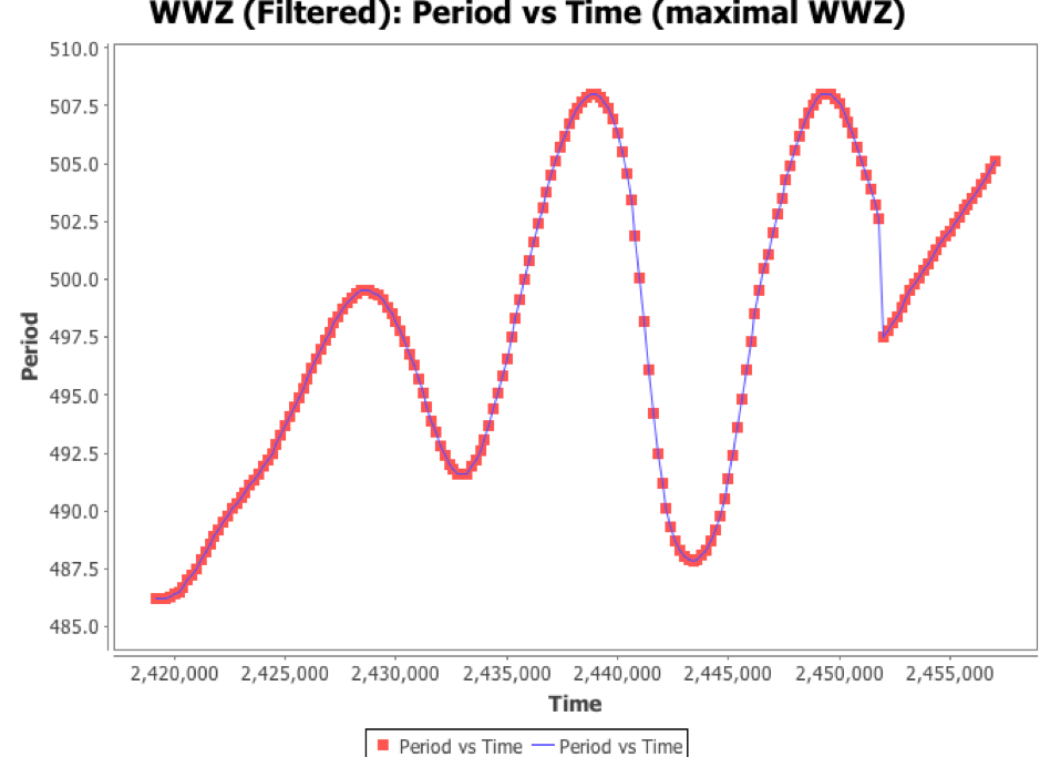 A DC DFT analysis of all observations in the AID shows an overall mean period of 497.7 days (harmonics of 249 and 166 days are clearly evident which indicates a non-sinusoidal element of the light curve). An annual alias period of 210 days is also readily apparent. There is also another signal at 514.6 days.