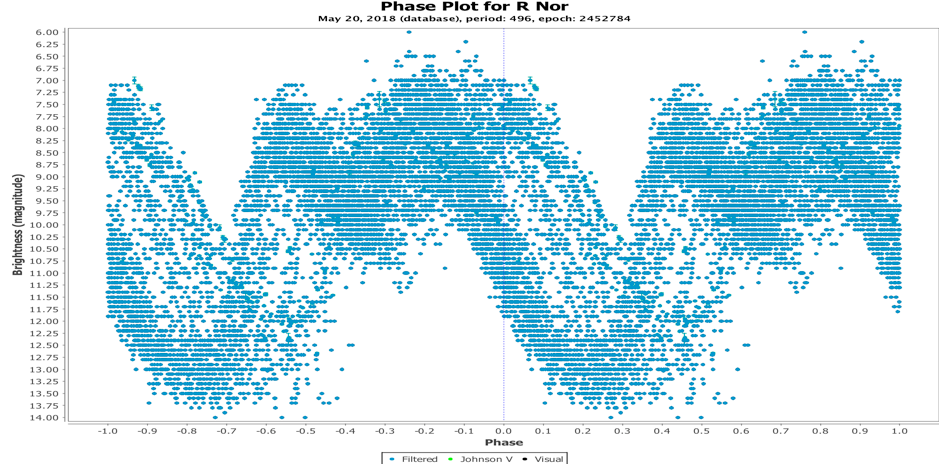 The most interesting feature displayed by R Nor is the dual maxima. The GCVS lists only 5 stars that show this sort of behaviour. These are R Cen, BH Cru, UZ Cir, R Nor and BN Sco. However, recent searching of ASAS data by Sebastian Otero has indicated there may be more (eg HR Pup and ASAS J143751-6454.9).
