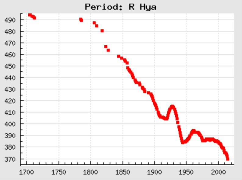 R Hya is another Mira star that is showing a declining period. It's gone from about 495 days around the year 1700, 480 days by 1800 and 450 days in 1850. By 1920 the period was 420 days and in 1950 it slowed down and started to vary between 380 to 395 days.