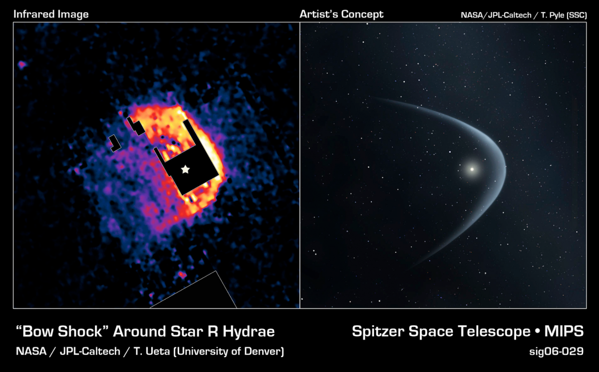 The NASA Spitzer Space Telescope found that there is a “bow-shock” caused by the stellar wind from R HYA hitting and pushing against gas and duct between stars. This maybe the first “bow-shock” seen associated wit a Mira. Please see https://photojournal.jpl.nasa.gov/catalog/PIA09070, http://kencroswell.com/RHydraeBowShock.html and https://arxiv.org/pdf/astro-ph/0607303.pdf for further information.