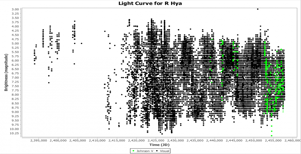 R Hydrae is an M (Mira) type of LPV of Spectral type M6e-M9eS(Tc). It's Magnitude Range 3.5 to 10.9 in both V and Visual. Currently there are 24,890 observations in the AAVSO International Database starting in April 5, 1842 although there are reports of observations going back to 1662. R HYA is located at 13h 29m 42.78s and -23d 16m 52.8s which means it can be observers from much of the Northern and Southern hemisphere. It is also bright enough that it should be a good object for Visual observers.