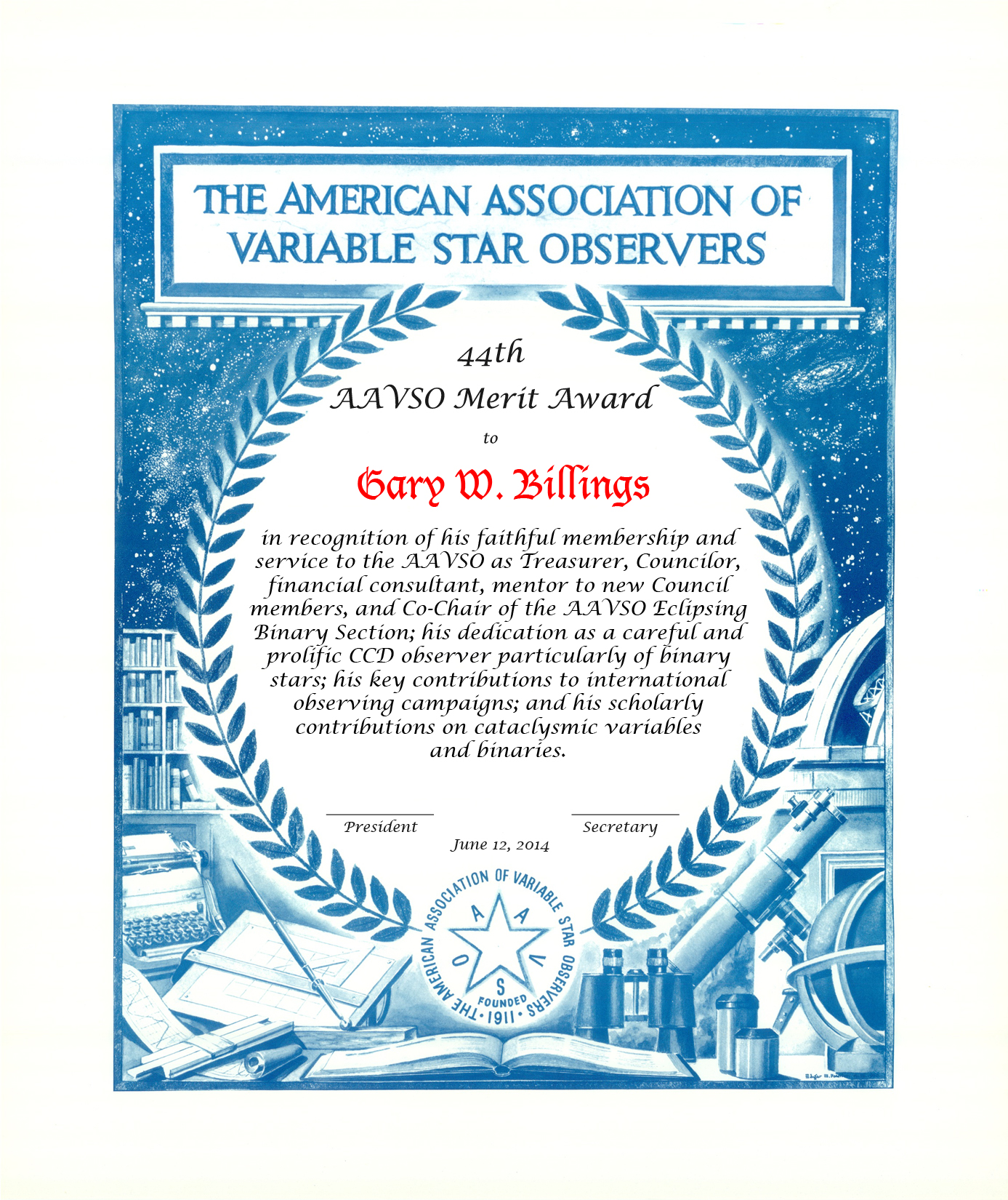 ... in recognition of over 35 years of dedicated service to the AAVSO as variable star observer, contributing nearly 160,000 observations, including timely observations of campaign stars; Council member and officer for 11 years; developer of observing tools and software, and a leader in the development of CCD observing standards and practices; and for his generous spirit and tireless enthusiasm for observing variable stars which have earned him the respect and admiration of astronomers around the world. (image of certificate)