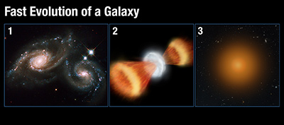 Astronomers have debated for decades how massive galaxies rapidly evolve from active star-forming machines to star-starved graveyards. Previous observations of these galaxies reveal geysers of gas shooting into space at up to 2 million miles an hour. Astronomers have suspected that powerful monster black holes lurking at the centers of the galaxies triggered the gaseous outflows and shut down star birth by blowing out any remaining fuel.