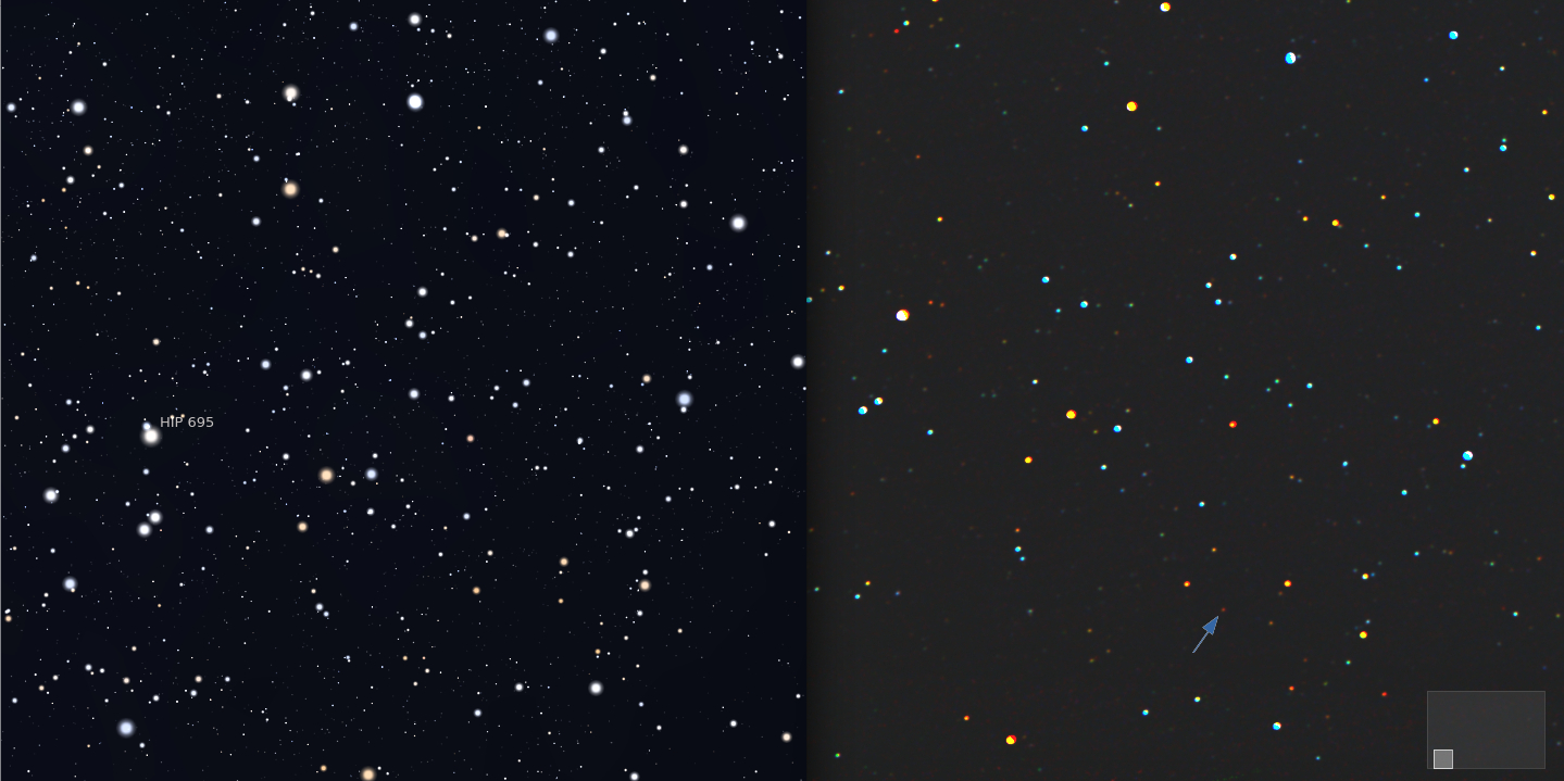 I was hoping to find some help here in identifying a star that shows up on one of my images. It looks like it might be a Mira, but I cannot be sure. It's a star field in Cassiopeia. On the left is a screen capture from Stellarium. On the right is my image. The arrow points to the star in question. It's bright enough that it should have easy shown on the Stellarium chart and doesn't appear to be a hot pixel. Does anyone know what it is?