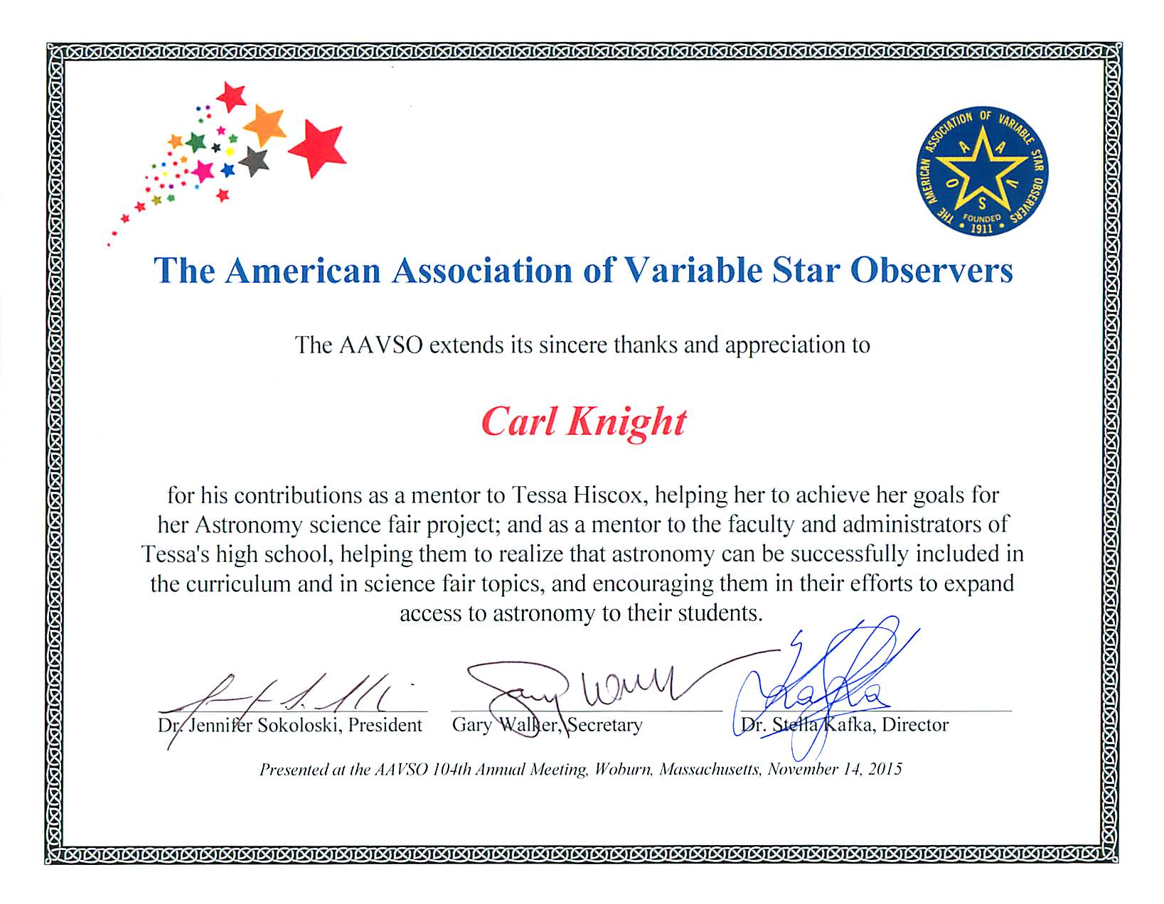 "for their valuable volunteer contributions to the AAVSO and the variable star community through their work on generating the VSX new data submission manual." (image of certificate)