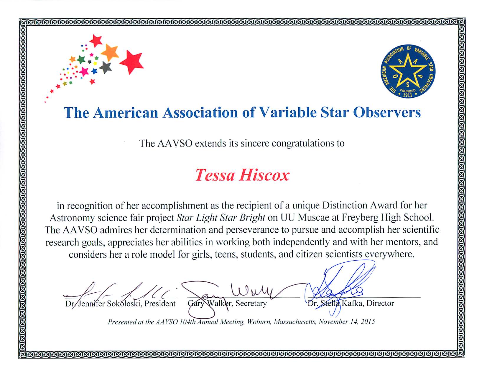 "in recognition of her accomplishment as the recipient of a unique Distinction Award for her Astronomy science fair project Star Light Star Bright on UU Muscae at Freyberg High School. The AAVSO admires her determination and perseverance to pursue and accomplish her scientific research goals, appreciates her abilities in working both independently and with her mentors, and considers her a role model for girls, teens, students, and citizen scientists everywhere." (image of certificate)
