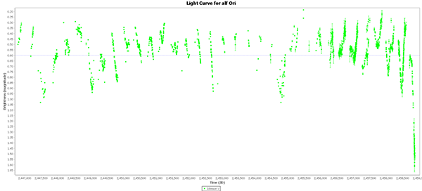 The dimming is very apparent when looking at the last 33 years of Johnson V data. The previous lows in this data were 1.03 measured by FEO on 2008 and 1.03 measured by WJM in 1988. Current V magnitudes are in the 1.5s.