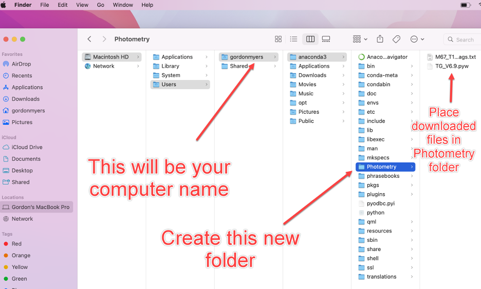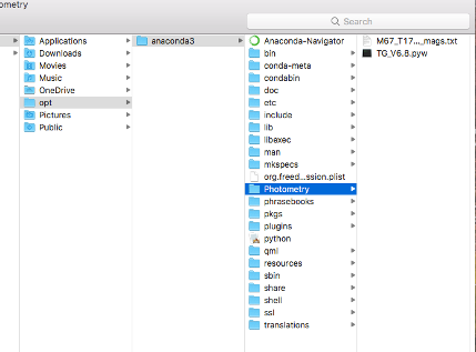 After successful installation of Anaconda, navigate to /Anaconda3 using Finder and create a new folder “Photometry” – e.g. /Anaconda3/Photometry. Copy the program TG_V6.9a.pyw and the demonstration file M67_T17_20140330_Photometry_Demo_instrument_mags.txt into the Photometry folder.