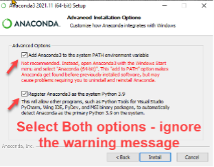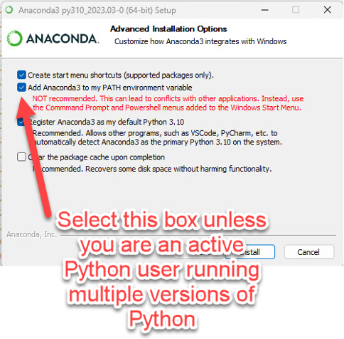 New Installations Requiring Anaconda Suite Download: TG runs with the standard Python suite known as Anaconda. Download the current Anaconda version from https://www.anaconda.com/products/distribution. (The current tested version as of this posting is Anaconda3-2023.03-Windows-x86_64.) Then run the install program, accepting defaults (including installing for “Just Me (recommended)”, EXCEPT for one item. On the Advanced options menu, select the three options shown below unless you are an experienced Python user who runs multiple versions of Python on your computer. This will install Anaconda into a new Anaconda3 folder c:/Users/(your user name)/Anaconda3