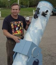 - my picture was taken in 1999 with my 10" scope, Blue Bertha, and my Chant medal. My hair was brown then; "silver fox" would be a better description now. I might also be a bit wider, too :-)