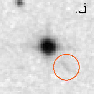 Another notable example of this is our Variable "Star" of the Season, 3C 273. Bev Oke and Maarten Schmidt (1963; AJ 68, 288) noted the existence of "an adjacent thin wisp or jet". You can faintly see it in Digital Sky Survey images of this quasar, pointed directly away from the central source to the southwest. The jet is perfectly aligned with the radio jet of 3C 273, and is believed to be synchrotron emission from the same source. The high-energy radiation comes mostly from knots in the jet, where the jet undergoes shocks as it runs into gas surrounding the central engine.