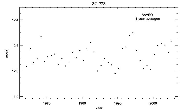 The quasar 3C 273 is a point source around magnitude 12.7 in the constellation Virgo (J2000 RA:12 29 06.7, Dec:+02 03 08.6), and AAVSO charts are available here. AAVSO observer Thomas Cragg (CR) made the first visual observation of 3C 273 on February 9, 1964 (mvis=12.9), and many others in the AAVSO community have enthusiastically followed this source over the last 40 years. The long-term light curve of 3C 273 has helped quasar theorists understand the behavior of these objects, and we urgently want the visual community to keep up the good work! As with many astronomical objects, the light curves of quasars become more and more valuable the longer they get, and your visual observations have made an important contribution to the science of these exciting objects.