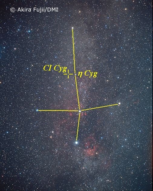 | The constellation of Cygnus is one of the most recognizable in the sky. Click on the above image for an enlarged view with the approximate location of CI Cyg indicated. Image: Akira Fujii, DMI. |
