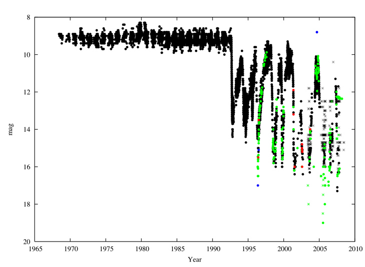 FG Sge was first noted as a variable in 1944 by Cuno Hoffmeister, but the star received scant observer attention (at least in printed papers), until 1960, when G. Richter published a study of the long-term photometric and spectroscopic behavior of FG Sge (or "377.1943 Sge"). The brightness of FG Sge increased by over four magnitudes since the start of the century, and he found evidence of smaller, short-term variations as well. Richter saw signatures of a nova in objective prism spectra, and he likened the star to the Z Andromedae-type symbiotic star AG Pegasi. Since then, many papers have detailed the remarkable evolution of FG Sge from a faint, hot, blue post-asymptotic giant branch star and planetary nebula in the making to a much cooler and brighter yellow supergiant. Even more exciting for variable star observers, following FG Sge's four-magnitude brightening and several decades of relative constancy, the star now appears to exhibit the dramatic and seemingly random fluctuations and fadings of the R Coronae Borealis class of variable stars. FG Sge is clearly a star undergoing extreme changes, and we're fortunate to be treated to its amazing show.