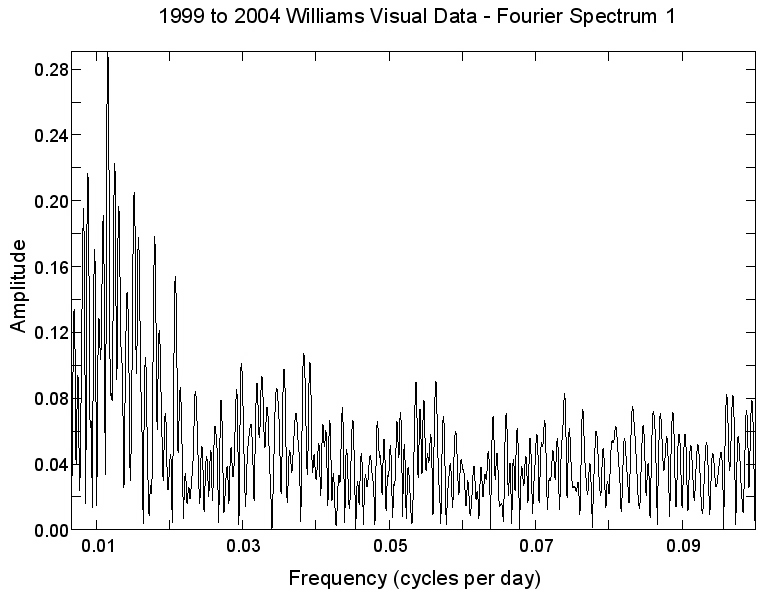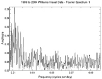 The variability was clearly not strictly periodic. The Period04 program was used to apply a two-period fit to each of six post-1985 datasets: the Lund CCD photometry, the Williams visual photometry, and four 4-year groupings of the Overbeek visual photometry. We arbitrarily chose to limit the fit to two periods. There is no evidence that the star is actually doubly or multi-periodic, as opposed to having a single period with variable amplitude; the data are not sufficient to make that distinction. And because of the seasonal gaps, there is the possibility of alias periods in the Fourier spectra. [Self-correlation analysis is not affected by alias periods.] The seasonal datasets are also not well suited for finding periods of over 100 days, because of their finite length, and the irregularity of the variability. The results are as follows: