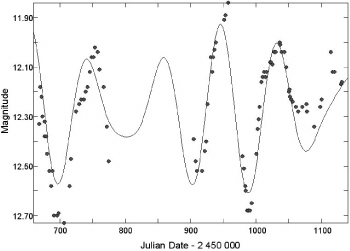 In order to understand what might account for V725's unique behavior, it is worth reviewing what is known about the nature of Population II Cepheids. Population II stars are older than the sun, and have masses similar to or less than that of the sun. They generally have lower abundances of the elements heavier than helium than the sun does. Population II Cepheids have periods of about 1 to 100 days. The short-period stars are called BL Herculis stars, the long-period stars generally have RV Tauri characteristics -- alternating deep and shallow minima. That leaves the medium-period stars, which are called W Virginis stars. You will find good articles, in the Variable Star of the Month/Season archives, on W Vir (Davis, 2003) and on the RV Tauri stars U Mon (Malatesta, 2003) and R Sct (Malatesta, 2000).