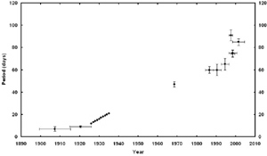 | Determinations of the period of V725 Sgr, with estimated error bars, versus epoch. The determinations prior to 1926 are uncertain. |