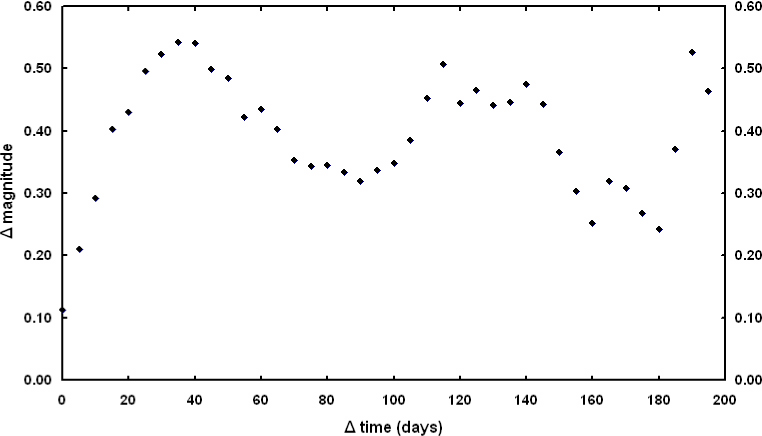 We began by digitizing the pre-1926 data that Swope analyzed. Between 1899 and 1926, the variability of V725 Sgr was close to the noise level, but we noted that there was a slight but consistent minimum in the self-correlation diagram at a period of 5-9 days (1899-1915) and 8-10 days (1915-1926), indicating a tendency for the star to vary on these time scales. For the data from 1922-1925, there was a clear minimum at about 9 days in the diagram.