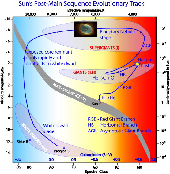 All of these variable types are in advanced stages of evolution, so we should also review what is known about the structure and evolution of sun-like stars in these geriatric phases. As they exhaust the hydrogen fuel in their cores, fusing it into helium, they swell up and become red giants. On the Hertzsprung-Russell diagram which plots luminosity or power against temperature (Figure 6), the star is said to move upward along the "giant branch" (RGB). When the temperature at the center of the core becomes high enough, the helium ignites in a "helium flash". The external results are not very dramatic. The star readjusts, contracts, and becomes a stable star fusing helium in its core, and continuing to fuse hydrogen in a thin shell around the core. On the Hertzsprung-Russell diagram, it sits on the "horizontal branch" (HB). As the star uses up its helium fuel, it again expands to become a red giant. Its path on the Hertzsprung-Russell diagram is slightly different, but gradually approaches the giant branch, so astronomers call it the "asymptotic giant branch" (AGB).